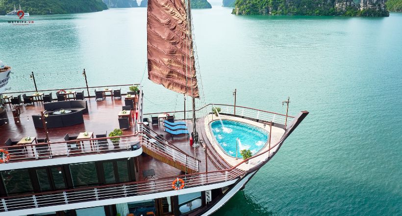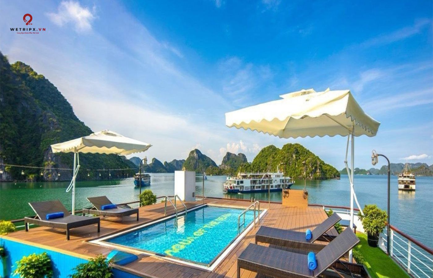- Bể bơi ngoài trời và phòng Spa thư giãn, mang đến trải nghiệm nghỉ dưỡng trọn vẹn ngay trên du thuyền