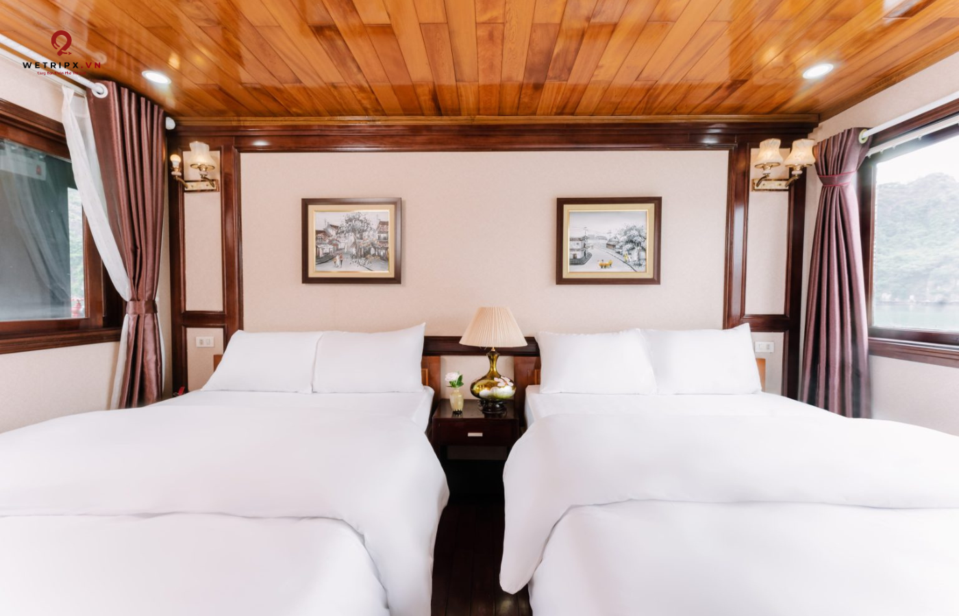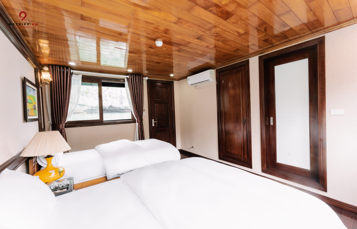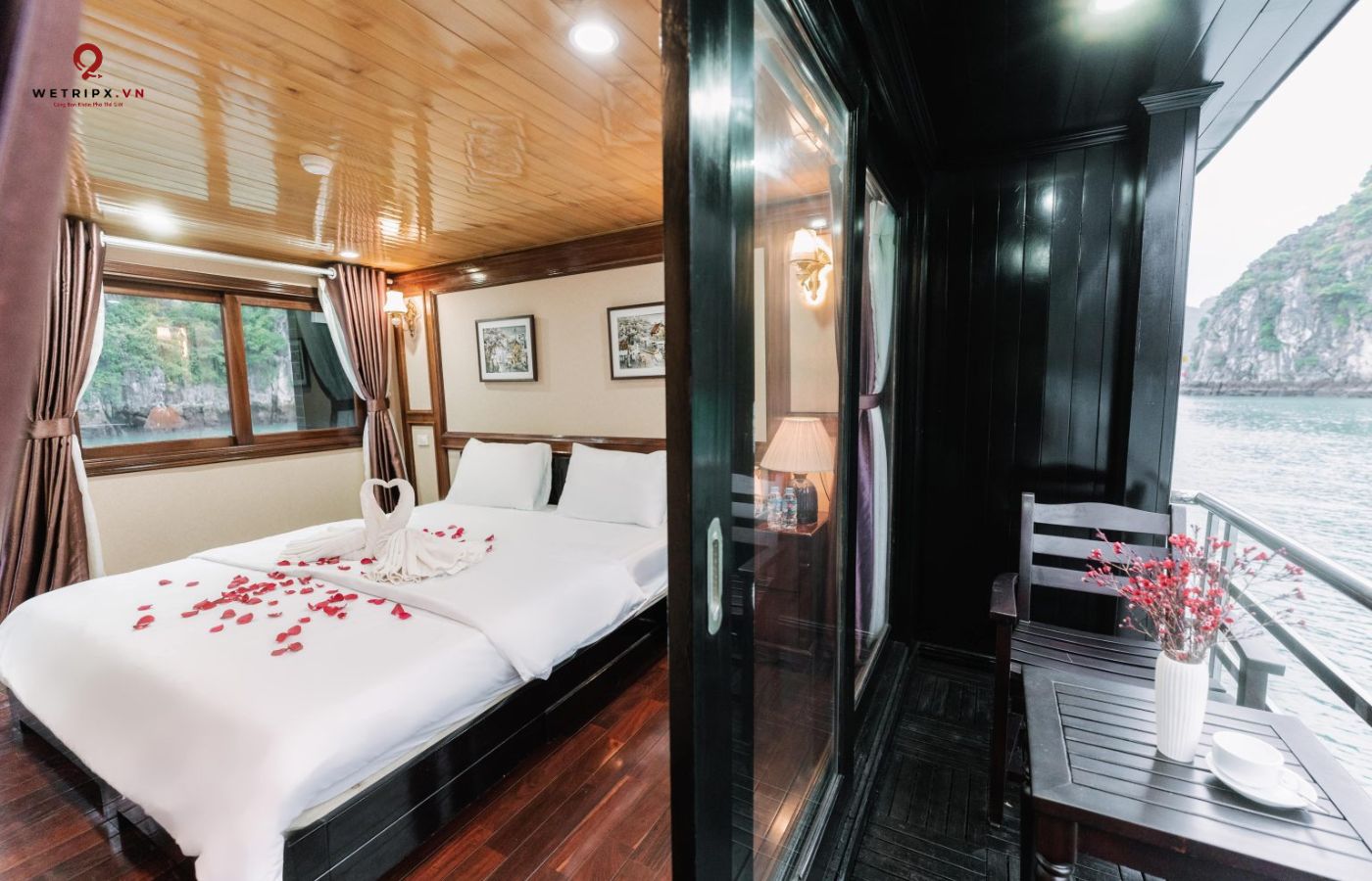Tàu gồm 3 tầng với 07 cabin hiện đại, mỗi phòng đều có phòng tắm riêng, cửa kính tràn viền view vịnh, mang đến không gian riêng tư và thư giãn tuyệt đối.