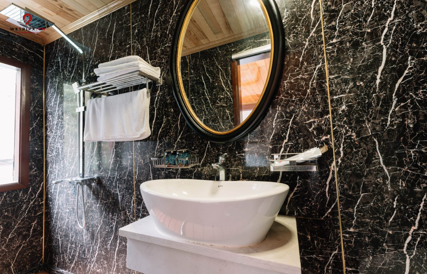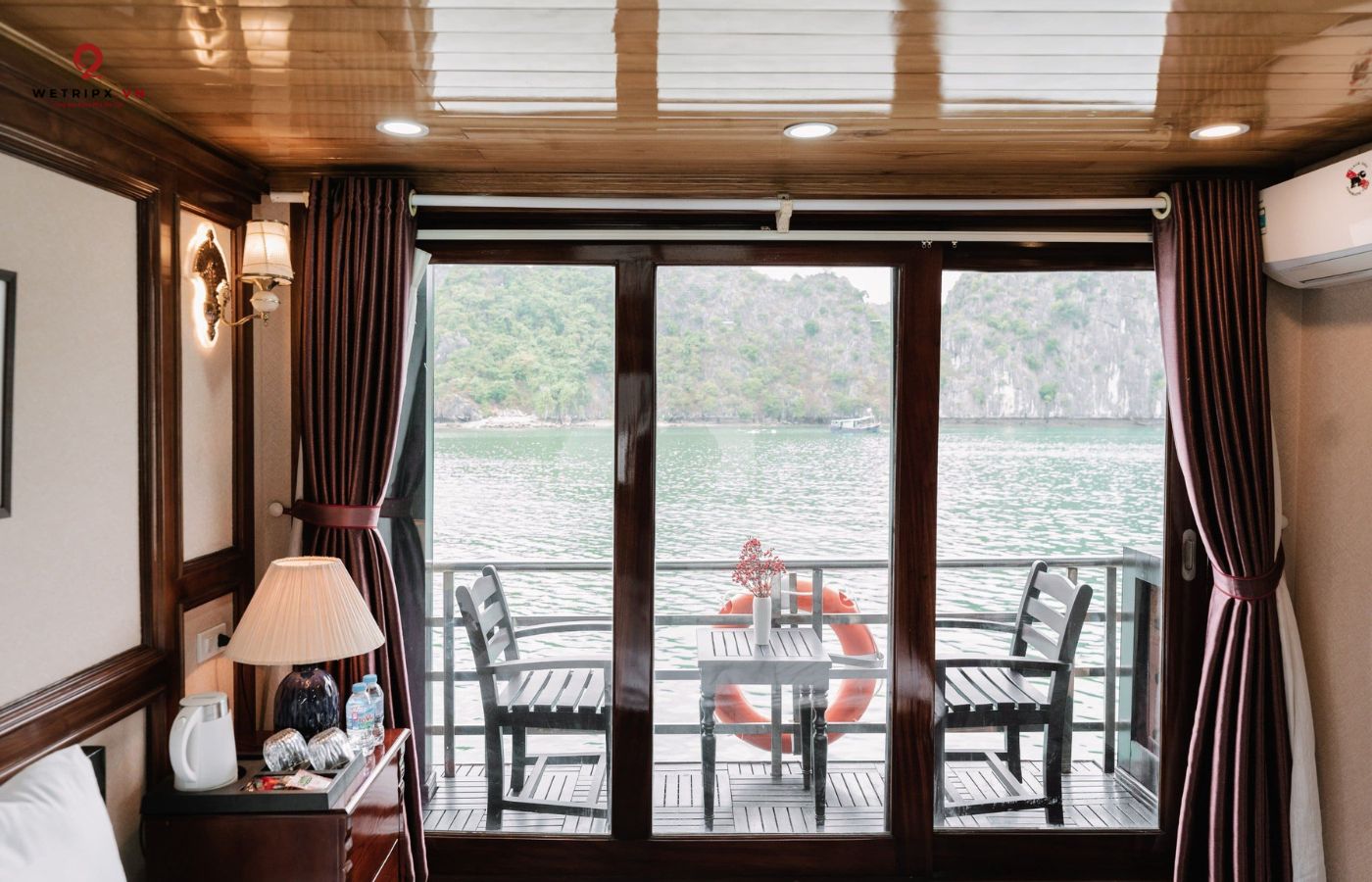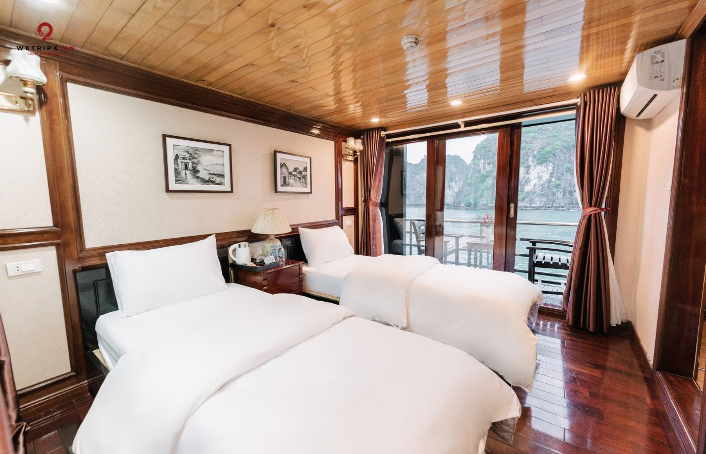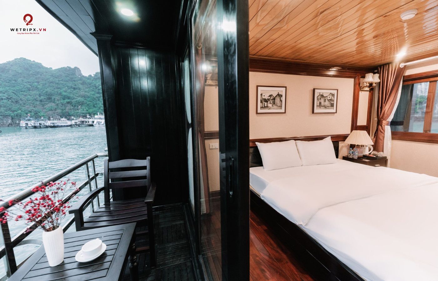 Tàu gồm 3 tầng với 07 cabin hiện đại, mỗi phòng đều có phòng tắm riêng, cửa kính tràn viền view vịnh, mang đến không gian riêng tư và thư giãn tuyệt đối.